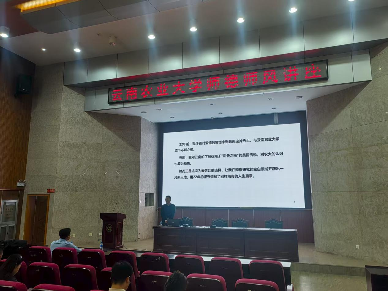邓明华教授以“‘椒’傲的事业,育人的初心”为题,结合自身22年立德树人工作经验,分享了自己深耕教育及科研一线的心得。他秉持“开学养正,耕读至诚”校训,创新教学和科研模式,将课堂与田间实践深度融合,培养出一批优秀学子和辣椒研究团队,建立多基因聚合育种体系,带领团队推动丘北辣椒品种三次更新,培育28个新品种,推广超800万亩,带动增收近百亿元,以“椒业”赋能乡村振兴。同时,他围绕新时代教师“四有”好老师标准、以教育家精神引领教育科研实践等内容,提出了具有针对性的思考与建议,为在场教职工上了一堂深刻的师德教育课。